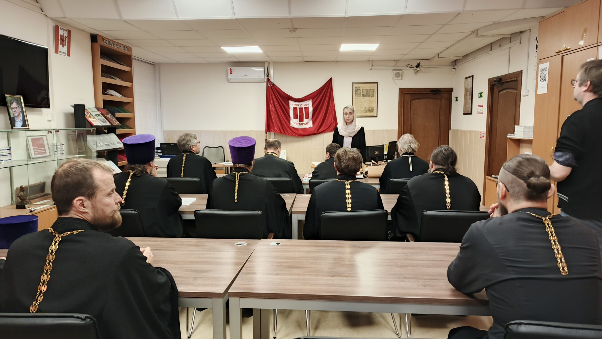 Занятие по предмету церковно-государственные отношения провела старший архивариус М.И. Дегтярева, затем тему продолжил преподаватель курсов иерей Петр Карелин.